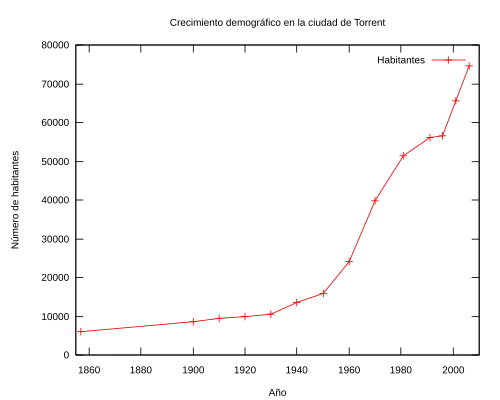 Grâce à son intégration dans l'aire métropolitaine de Valence, principalement comme ville-dortoir, Torrent a connu une forte croissance démographique depuis les années 1950.