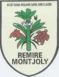Le blason sur fond jaune d’or est bordé d’un liseré rouge. Il porte l’inscription ‘Rémire-Montjoly’. Dans le milieu de l’écu, sur sa longueur et l’occupant dans sa totalité, une canne à sucre pour rappeler le fait que la canne fut plantée pour la première fois à Rémire, importée en 1877 par Mademoiselle Poivre, une ancêtre de PPDA (Patrick Poivre d’Arvor). Surmontant la tige de canne à sucre, presque jusqu’au faîte, un œil pour symboliser la propriété de Monseigneur de Beauregard. C’est sa devise qui sert actuellement à la commune ‘N’est beau regard sans âme claire’. A dextre, une tête de tapir évoque la forêt qui abrite ces animaux, à senestre, une tortue rappelle la partie maritime de la commune.
