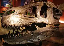 Torvosaurus tanneri était un grand théropode particulièrement robuste ; sa grande tête était munie d'une rangée de longues dents en forme de lames, dont certaines dépassaient les 10 centimètres[8].