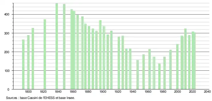 L'évolution du nombre d'habitants est connue à travers les recensements de la population effectués dans la commune depuis 1793. Pour les communes de moins de 10 000 habitants, une enquête de recensement portant sur toute la population est réalisée tous les cinq ans, les populations de référence des années intermédiaires étant quant à elles estimées par interpolation ou extrapolation[17]. Pour la commune, le premier recensement exhaustif entrant dans le cadre du nouveau dispositif a été réalisé en 2005[18].