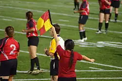 L'arbitre de touche se déplace alors jusqu'au lieu de sortie de la balle, y lève son drapeau, et indique avec son bras l'équipe bénéficiant du lancer.