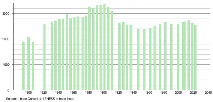 L'évolution du nombre d'habitants est connue à travers les recensements de la population effectués dans la commune depuis 1793. Pour les communes de moins de 10000habitants, une enquête de recensement portant sur toute la population est réalisée tous les cinqans, les populations de référence des années intermédiaires étant quant à elles estimées par interpolation ou extrapolation[43]. Pour la commune, le premier recensement exhaustif entrant dans le cadre du nouveau dispositif a été réalisé en 2008[44].