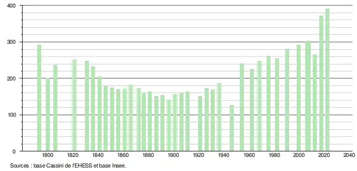 L'évolution du nombre d'habitants est connue à travers les recensements de la population effectués dans la commune depuis 1793. Pour les communes de moins de 10 000 habitants, une enquête de recensement portant sur toute la population est réalisée tous les cinq ans, les populations de référence des années intermédiaires étant quant à elles estimées par interpolation ou extrapolation[23]. Pour la commune, le premier recensement exhaustif entrant dans le cadre du nouveau dispositif a été réalisé en 2007[24].