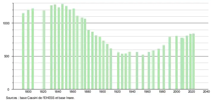 L'évolution du nombre d'habitants est connue à travers les recensements de la population effectués dans la commune depuis 1793. Pour les communes de moins de 10 000 habitants, une enquête de recensement portant sur toute la population est réalisée tous les cinq ans, les populations de référence des années intermédiaires étant quant à elles estimées par interpolation ou extrapolation[26]. Pour la commune, le premier recensement exhaustif entrant dans le cadre du nouveau dispositif a été réalisé en 2008[27].