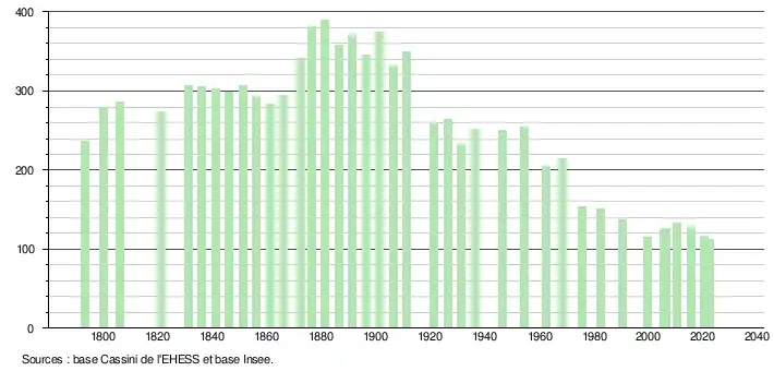 L'évolution du nombre d'habitants est connue à travers les recensements de la population effectués dans la commune depuis 1793. Pour les communes de moins de 10 000 habitants, une enquête de recensement portant sur toute la population est réalisée tous les cinq ans, les populations de référence des années intermédiaires étant quant à elles estimées par interpolation ou extrapolation[20]. Pour la commune, le premier recensement exhaustif entrant dans le cadre du nouveau dispositif a été réalisé en 2005[21].