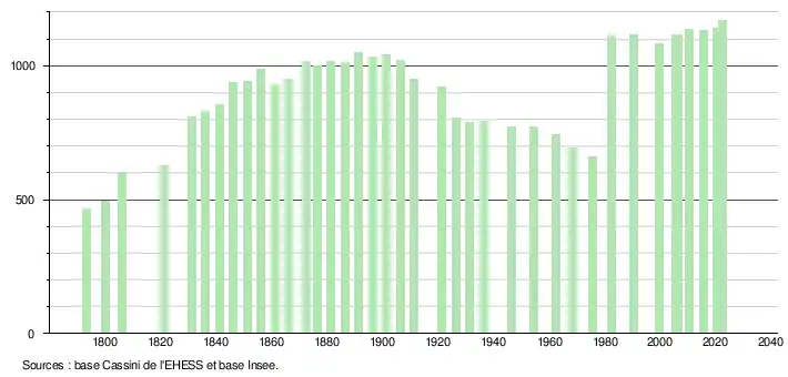 L'évolution du nombre d'habitants est connue à travers les recensements de la population effectués dans la commune depuis 1793. Pour les communes de moins de 10 000 habitants, une enquête de recensement portant sur toute la population est réalisée tous les cinq ans, les populations de référence des années intermédiaires étant quant à elles estimées par interpolation ou extrapolation[28]. Pour la commune, le premier recensement exhaustif entrant dans le cadre du nouveau dispositif a été réalisé en 2005[29].