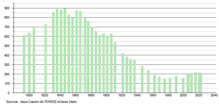 L'évolution du nombre d'habitants est connue à travers les recensements de la population effectués dans la commune depuis 1793. Pour les communes de moins de 10 000 habitants, une enquête de recensement portant sur toute la population est réalisée tous les cinq ans, les populations de référence des années intermédiaires étant quant à elles estimées par interpolation ou extrapolation[21]. Pour la commune, le premier recensement exhaustif entrant dans le cadre du nouveau dispositif a été réalisé en 2005[22].