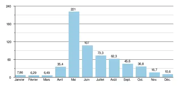 Le débit moyen mensuel observé en février (minimum d'étiage) est de 6,29 m3/s, soit moins de 3 % du débit moyen du mois de mai (221 m3/s), ce qui souligne l'amplitude élevée des variations saisonnières. Ces écarts de débit mensuel peuvent être plus marqués encore d'après les années : sur la durée d'observation de 27 ans, le débit mensuel minimal a été de 3,71 m3/s en , tandis que le débit mensuel maximal s'élevait à 384 m3/s en .