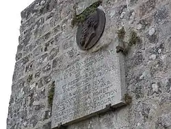 Sur le mur côté nord-ouest, sont apposés un médaillon représentant le profil de Claude-François Denecourt et une plaque commémorative rappelant la reconstruction de la tour Denecourt.