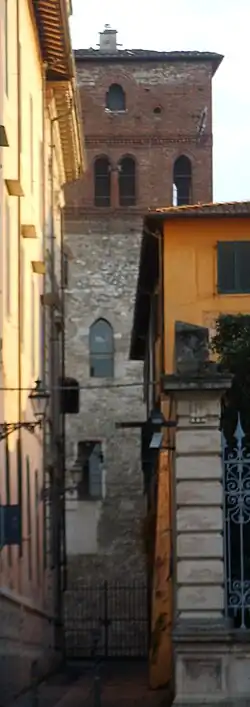 La tour rectangulaire s'élève sur sept étages principaux avec des hauteurs de plafond variables et la partie la plus ancienne remonte à la seconde moitié du XIIe siècle (reconnaissable aux pierres de taille jusqu'au cinquième étage en pierre Verrucana gris clair), tandis que la partie supérieure en brique rouge date du XIVe siècle. Dans la partie la plus haute se trouve une décoration réalisée avec les différentes dispositions des briques pour former des bandes décorées.