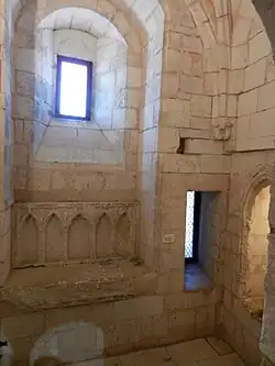 La salle possède une voûte sur croisée d’ogives qui repose sur d’anciennes sculptures qui peuvent encore se deviner. Elle est équipée d’un autel et d’un retable gothiques[12], ainsi que d’une piscine liturgique, petite cuve avec écoulement en puits perdu, servant à déverser les eaux de purification ayant servi au célébrant. Les participants prenaient place dans la grande pièce voisine et assistaient à la célébration à travers un hagioscope[13].