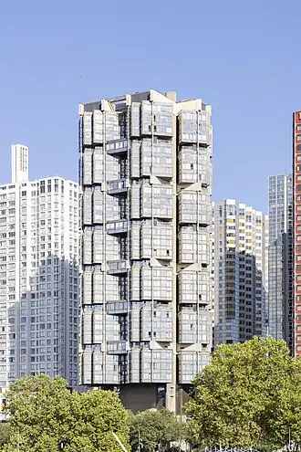 Avec une physionomie immédiatement identifiable, de style brutaliste, c'est l'une des tours les plus originales du Front de Seine.