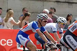 Indique un maillot de champion national ou mondial, suivi de sa spécialité