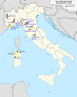 La course débute en Toscane avant de se rendre en Émilie-Romagne, au Piémont, en Ligurie avant de finir en Sardaigne. Il a une étape de moins que l'année précédente. Elle commence avec un contre-la-montre de quatre kilomètres, tout plat. La seconde étape comporte le Passo della Colla comme unique difficulté. Une fois passé, le parcours est en descente jusqu'à l'arrivée quinze kilomètres plus loin. La troisième étape est globalement plate. L'étape suivante est vallonnée avec trois montées classées. La dernière se situe à quatorze kilomètres de l'arrivée avec une descente par la suite. Elle peut couronner une puncheuse, mais également une sprinteuse. La cinquième étape est montagneuse, avec la montée du Passo del Lupo en début de parcours, puis celle de Vietti et Sant'Ignazio à la fin. La sixième étape et vallonnée et à priori propice aux échappées. L'arrivée est en côte. La septième étape est difficile avec deux ascensions avant l'arrivée au sommet à Alassio. Après une journée de repos, la course parcourt la Sardaigne. La huitième étape ondule, mais la fin est globalement en descente avant l'arrivée en montée. La dernière étape présente un profil similaire avec de petites difficultés, mais une très longue phase descendante sur la fin, ce qui favorise une arrivée groupée[1].