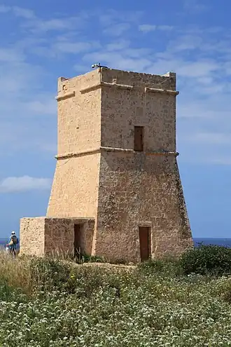 - ↑ Charles Debono, « Fortifications - Ghajn Tuffieha Tower » [archive du ], sur Mellieha.com (consulté le )
