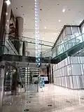 À l'intérieur, le hall d'entrée a une hauteur maximale de 10 mètres et est fermé de tous côtés par des vitrages allant du sol au plafond. Le plan d'étage est de forme rectangulaire et mesure 51 mètres sur 33.