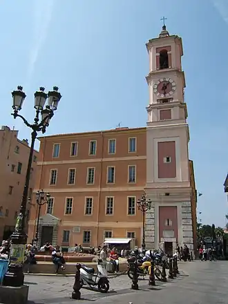 La grande cloche appelée Sainte-Marie-Madeleine est mise en place le . La tour, qui était surmontée de l'aigle de Nice, était, au moment de sa construction, isolée sur la place, avant la construction de la caserne Rusca, en 1780.
