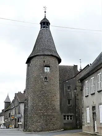 La tour à l'entrée du bourg. En arrière plan, l'échauguette de la Maison Chevanne (Office de tourisme et musée de l'air).