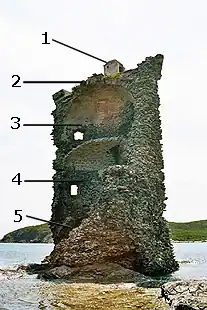 - la réserve, au sous-sol de la tour ; une niche servait à ranger les vivres ; on y stockait également les munitions. L'eau y était conservée dans une citerne, alimentée depuis la terrasse par une conduite directe ;