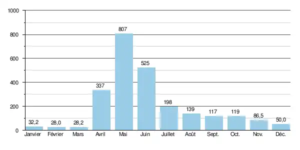 En ne considérant que la période estivale, la seule vraiment importante car libre de glaces (de mai à octobre inclus), le débit mensuel minimal observé a été de 21,3 m3/s en .