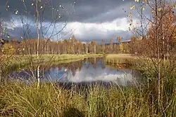 Les traces de l'extraction de tourbe abandonnée sont clairement visibles dans le paysage. Les bords de coupe encore préservés par endroits témoignent de l'épaisseur des couches de tourbe d'origine. Les dépressions, qui apparaissent aujourd'hui comme des étangs dans les tourbières, proviennent des zones d'extraction. Les voies d'accès aux zones d'extraction et les sentiers ont également endommagé la couche de tourbe. Dans certaines zones intensivement parcourues lors de l'exploitation de la tourbe[1], des tourbières planes se sont développées après la fin des travaux. Après l'extraction de la tourbe, une végétation pionnière et des forêts se sont développées sur de vastes étendues des anciennes zones marécageuses. Même les zones préparées pour l'extraction de la tourbe, par exemple par drainage, mais finalement non exploitées, ont été conquises par la forêt, mettant ainsi en péril la végétation de tourbière[15].