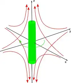 La solution explicite en géométrie cylindrique avec source sur l'axe z de rayon a été résolue par Prabakaran Rajamanickam et Adam D. Weiss[14]. La solution est exprimée dans le système de coordonnées cylindriques s'écrit :