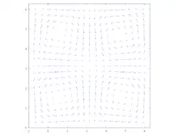 En mécanique des fluides le tourbillon de Taylor-Green est une solution analytique périodique des équations de Navier-Stokes en incompressible et en deux dimensions d'espace. Il décrit un ensemble de tourbillons qui s'amortissent avec le temps. Il a été décrit par Geoffrey Ingram Taylor et Albert Edward Green[1] et est utilisé comme benchmark pour les méthodes numériques et comme conditions initiales pour l'étude des problèmes de transition vers la turbulence.