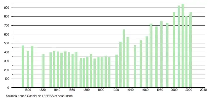 L'évolution du nombre d'habitants est connue à travers les recensements de la population effectués dans la commune depuis 1793. Pour les communes de moins de 10 000 habitants, une enquête de recensement portant sur toute la population est réalisée tous les cinq ans, les populations de référence des années intermédiaires étant quant à elles estimées par interpolation ou extrapolation[34]. Pour la commune, le premier recensement exhaustif entrant dans le cadre du nouveau dispositif a été réalisé en 2006[35].