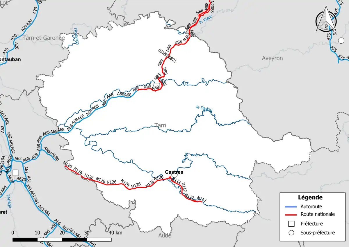 En dépit d'un enclavement hors des grands axes de circulation, le Tarn est voisin de Toulouse, relié par l'A68. Il longe le tracé de la RD 988 qui se poursuit vers Rodez et Lyon. A Albi, la DR 999 conduit vers le sud-Aveyron (Millau) et Montpellier ; cette même route, vers le nord-est, atteint Montauban et l'autoroute A20 vers Paris. La RD 612 conduit d'Albi à Castres, Mazamet et Béziers. La Route nationale 126 et la RD 112 relient Toulouse et Castres. Le réseau routier est globalement meilleur dans la partie de plaine à l'ouest que dans les zones de relief du sud et de l'est.