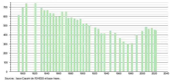 L'évolution du nombre d'habitants est connue à travers les recensements de la population effectués dans la commune depuis 1793. Pour les communes de moins de 10 000 habitants, une enquête de recensement portant sur toute la population est réalisée tous les cinq ans, les populations de référence des années intermédiaires étant quant à elles estimées par interpolation ou extrapolation[18]. Pour la commune, le premier recensement exhaustif entrant dans le cadre du nouveau dispositif a été réalisé en 2005[19].
