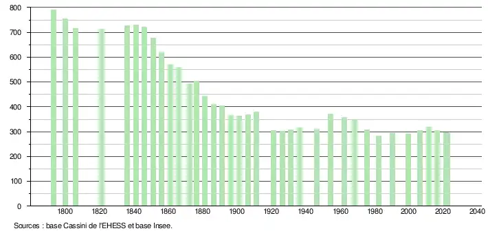 L'évolution du nombre d'habitants est connue à travers les recensements de la population effectués dans la commune depuis 1793. Pour les communes de moins de 10 000 habitants, une enquête de recensement portant sur toute la population est réalisée tous les cinq ans, les populations de référence des années intermédiaires étant quant à elles estimées par interpolation ou extrapolation[21]. Pour la commune, le premier recensement exhaustif entrant dans le cadre du nouveau dispositif a été réalisé en 2006[22].