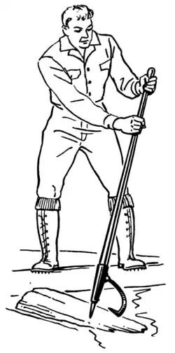 Après avoir planté le pic dans la bille, le croc vient saisir un second point sur le tronc. Le draveur a ainsi un bras de levier lui permettant de tourner ou de glisser la bille.