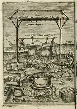 Le plus souvent, les foyers et cheminées sont équipés de « landiers à crochets » ou « hâtiers[2] », grands chenets sur lesquels tournent la broche[3]. L'usage des tournebroches permet de cuire uniformément les faces de la viande et arroser automatiquement le rôti, le jus qui s'en écoule restant à sa surface plus longtemps en raison de la rotation, ce qui charge le jus en sucs avant qu'il ne tombe dans la lèchefrite[4].