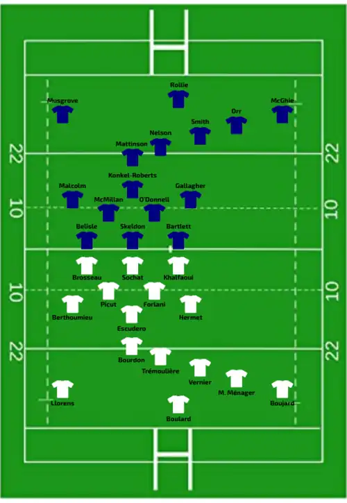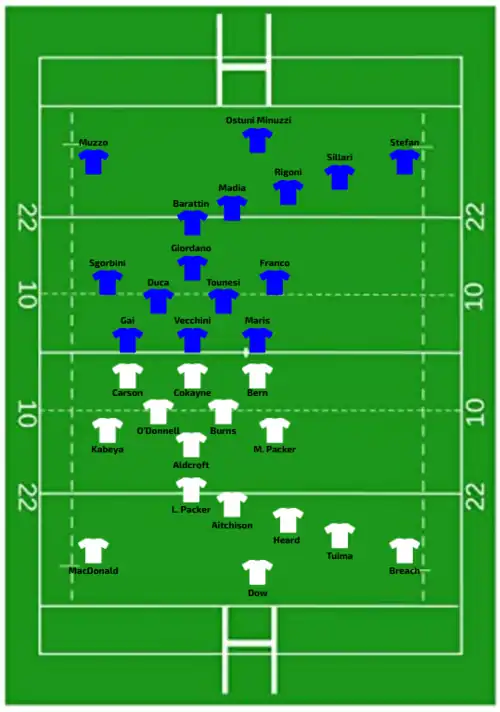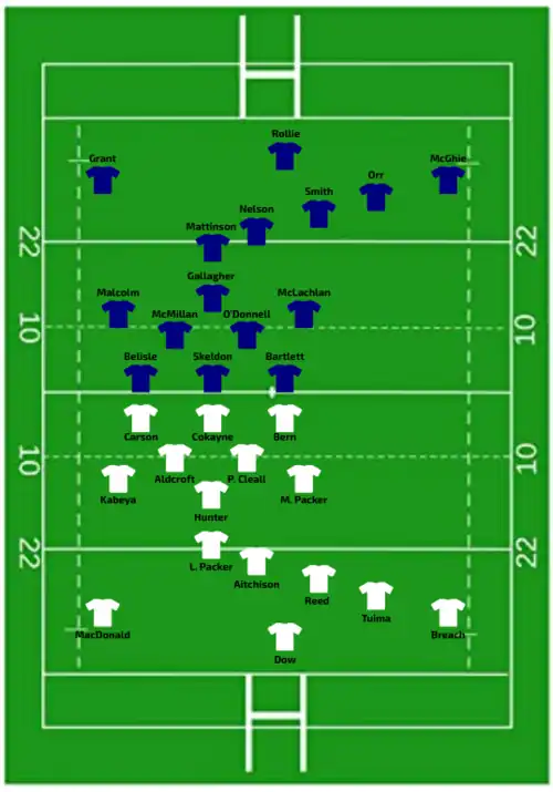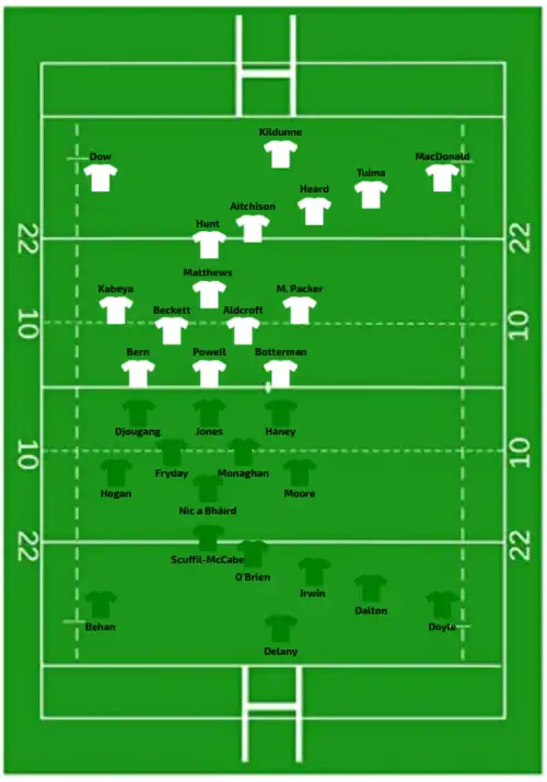 - 8 essais de Beckett (1re), Heard (15e), Kildunne (20e), M.Packer (25e), Talling (35e), Reed (70e) et Matthews (77e, 80e+2).