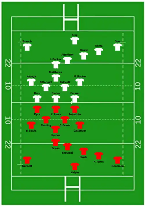 - 6 essais de Dow (16e), M.Packer (25e), Matthews (31e), pénalité (35e), Aldcroft (40e+1) et Davies (59e).