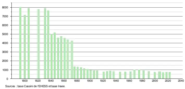 | L'évolution du nombre d'habitants est connue à travers les recensements de la population effectués dans la commune depuis 1793. Pour les communes de moins de 10 000 habitants, une enquête de recensement portant sur toute la population est réalisée tous les cinq ans, les populations de référence des années intermédiaires étant quant à elles estimées par interpolation ou extrapolation[25]. Pour la commune, le premier recensement exhaustif entrant dans le cadre du nouveau dispositif a été réalisé en 2007[26]. En 2022, la commune comptait 742 habitants[Note 2], en évolution de +0,54 % par rapport à 2016 (Lot-et-Garonne : −0,18 %, France hors Mayotte : +2,11 %). |