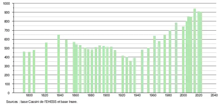 L'évolution du nombre d'habitants est connue à travers les recensements de la population effectués dans la commune depuis 1793. Pour les communes de moins de 10 000 habitants, une enquête de recensement portant sur toute la population est réalisée tous les cinq ans, les populations de référence des années intermédiaires étant quant à elles estimées par interpolation ou extrapolation[9]. Pour la commune, le premier recensement exhaustif entrant dans le cadre du nouveau dispositif a été réalisé en 2004[10].