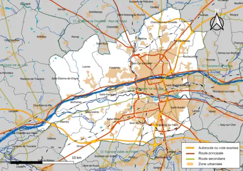Située au centre du département d'Indre-et-Loire, l'intercommunalité Tours Métropole Val de Loire regroupe 22 communes et présente une superficie de 389,2 km2[6].