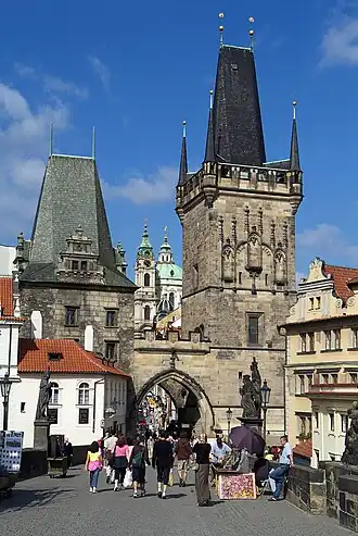 Les tours du pont de Malá Strana sont reliées par une porte gothique monumentale, qui constitue l'entrée de la Petite Ville. Elle a probablement été construite au tournant des XIVe et XVe siècles, sous le règne du roi Venceslas IV. La double porte est voûtée avec deux arcs gothiques au sommet, avec une galerie et des créneaux. Au Moyen Âge, elle était fermée la nuit ou en cas de danger par une porte en bois, éventuellement munie d'une grille en fer. L'époque de la création de la porte est évoquée par des repères historiques en pierre associés au règne de Václav IV. Du côté du pont, on trouve un lion luxembourgeois, un lion de Bohême, un aigle morave, les armoiries de la Vieille Ville de Prague, et du côté de la rue Mostecká, l'aigle de Wrocław, le lion de Bohême, les armoiries de la Basse-Lusace et de la Haute-Lusace, ainsi que les armoiries de la Petite-Ville. Le visiteur attentif qui passe la porte verra sous la galerie de pierre d'étranges rainures profondes dans la maçonnerie - le travail des anciens gardes du pont qui ont longtemps fait grincer leurs armes contre la pierre. L'histoire de la mort malheureuse du chevalier Pertolt, qui passait la porte en 1250 lorsque deux corbeaux se battaient sur les créneaux, est liée à la galerie elle-même. Le combat des oiseaux a libéré une pierre qui a frappé le chevalier à la tête et l'a tué sur le coup. tours du pont de la Petite Ville sont l'un des monuments les plus précieux de Prague et, depuis 2020, elles sont gérées par l'organisme Prague City Tourism (cs).