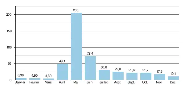 Le débit moyen mensuel observé en mars (minimum d'étiage) est de 4,30 m3/s, soit près à peine plus de 2 % du débit moyen du mois de mai (205 m3/s), ce qui souligne l'amplitude très élevée des variations saisonnières, même dans le cadre sibérien où les écarts sont souvent très importants. Ces écarts de débit mensuel peuvent être encore plus marqués d'après les années : sur la durée d'observation de 23 ans, le débit mensuel minimal a été de 1,66 m3/s en , tandis que le débit mensuel maximal s'élevait à 404 m3/s en .