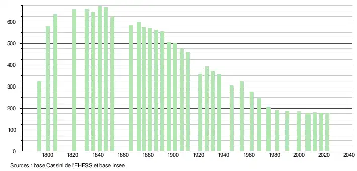 L'évolution du nombre d'habitants est connue à travers les recensements de la population effectués dans la commune depuis 1793. Pour les communes de moins de 10 000 habitants, une enquête de recensement portant sur toute la population est réalisée tous les cinq ans, les populations de référence des années intermédiaires étant quant à elles estimées par interpolation ou extrapolation[20]. Pour la commune, le premier recensement exhaustif entrant dans le cadre du nouveau dispositif a été réalisé en 2007[21].