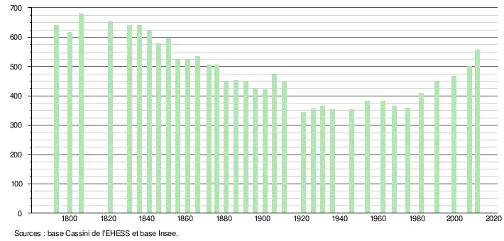 - ↑ Par convention dans Wikipédia, le principe a été retenu de n’afficher dans le tableau des recensements et le graphique, pour les populations légales postérieures à 1999, que les populations correspondant à une enquête exhaustive de recensement pour les communes de moins de 10 000 habitants, et que les populations des années 2006, 2011, 2016, etc. pour les communes de plus de 10 000 habitants, ainsi que la dernière population légale publiée par l’Insee pour l'ensemble des communes.