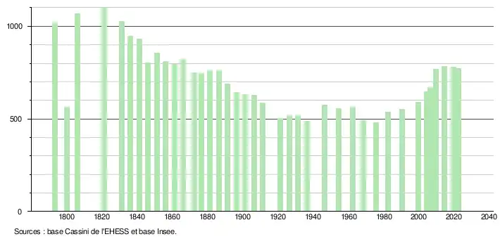L'évolution du nombre d'habitants est connue à travers les recensements de la population effectués dans la commune depuis 1793. Pour les communes de moins de 10 000 habitants, une enquête de recensement portant sur toute la population est réalisée tous les cinq ans, les populations de référence des années intermédiaires étant quant à elles estimées par interpolation ou extrapolation[29]. Pour la commune, le premier recensement exhaustif entrant dans le cadre du nouveau dispositif a été réalisé en 2004[30].
