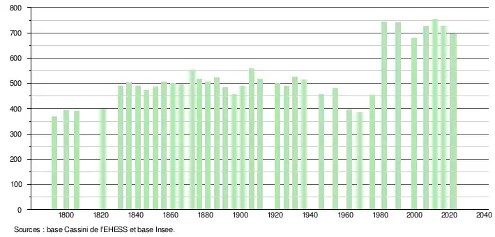L'évolution du nombre d'habitants est connue à travers les recensements de la population effectués dans la commune depuis 1793. Pour les communes de moins de 10 000 habitants, une enquête de recensement portant sur toute la population est réalisée tous les cinq ans, les populations de référence des années intermédiaires étant quant à elles estimées par interpolation ou extrapolation[21]. Pour la commune, le premier recensement exhaustif entrant dans le cadre du nouveau dispositif a été réalisé en 2006[22].