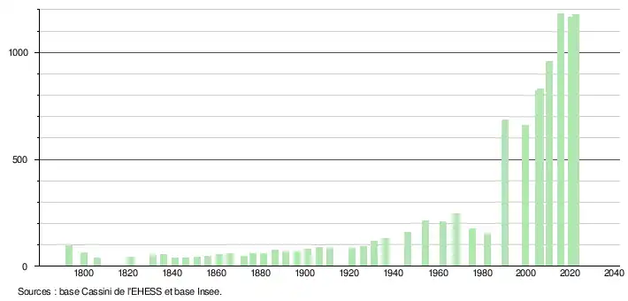 L'évolution du nombre d'habitants est connue à travers les recensements de la population effectués dans la commune depuis 1793. Pour les communes de moins de 10 000 habitants, une enquête de recensement portant sur toute la population est réalisée tous les cinq ans, les populations de référence des années intermédiaires étant quant à elles estimées par interpolation ou extrapolation[20]. Pour la commune, le premier recensement exhaustif entrant dans le cadre du nouveau dispositif a été réalisé en 2005[21].