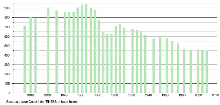 - ↑ Par convention dans Wikipédia, le principe a été retenu de n’afficher dans le tableau des recensements et le graphique, pour les populations légales postérieures à 1999, que les populations correspondant à une enquête exhaustive de recensement pour les communes de moins de 10 000 habitants, et que les populations des années 2006, 2011, 2016, etc. pour les communes de plus de 10 000 habitants, ainsi que la dernière population légale publiée par l’Insee pour l'ensemble des communes.
