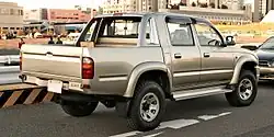 Le Pickup Hilux, premier à avoir une suspension avant indépendante (IFS) avec barres de torsion et ressorts à lames à l'arrière. Les feux arrière sont clairs et rouge avec 4 trous de vis.