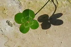 À noter la forme rare de trèfle à quatre feuilles, qui aurait une origine génétique.