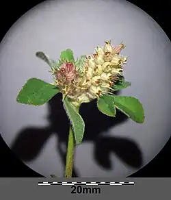 L'inflorescence mesure de 10 à 11 mm[3]. Les fleurs sont rosées, petites, se détachant aisément à la maturité, en têtes ovoïdes ou oblongues, sessiles, axillaires et terminales, ordinairement solitaires ; le calice est velu, ovoïde, à la fin renflé-ventru, à gorge ouverte, un peu resserrée, velue, à dents dressées-étalées, raides, en alêne, peu inégales, l'inférieure égalant le tube, la corolle égalant ou dépassant le calice[2].