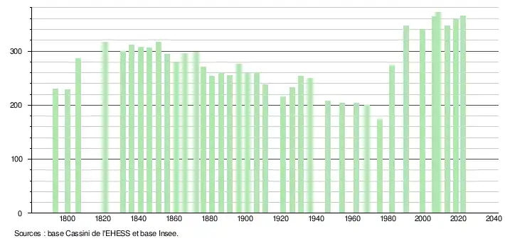 - ↑ Fiches Insee - Populations de référence de la commune pour les années 2006, 2007, 2008, 2009, 2010, 2011, 2012, 2013, 2014, 2015, 2016, 2017, 2018, 2019, 2020, 2021 et 2022.